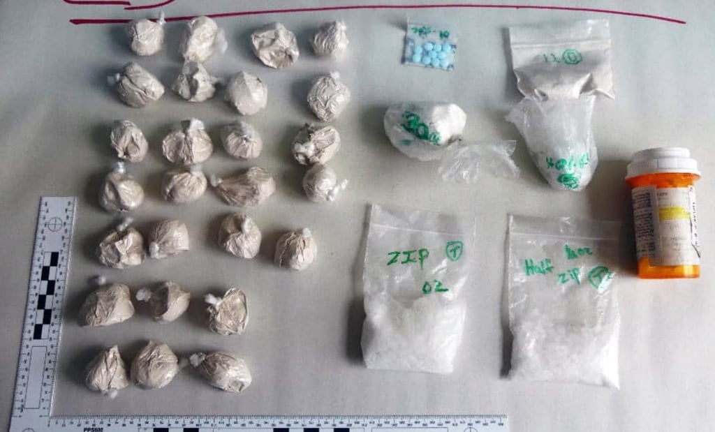 Fentanyl, crack cocaine, powdered cocaine, methamphetamine and Oxycodone tablets found in the hotel room of a Maine man. (Courtesy Tewksbury Police Department)