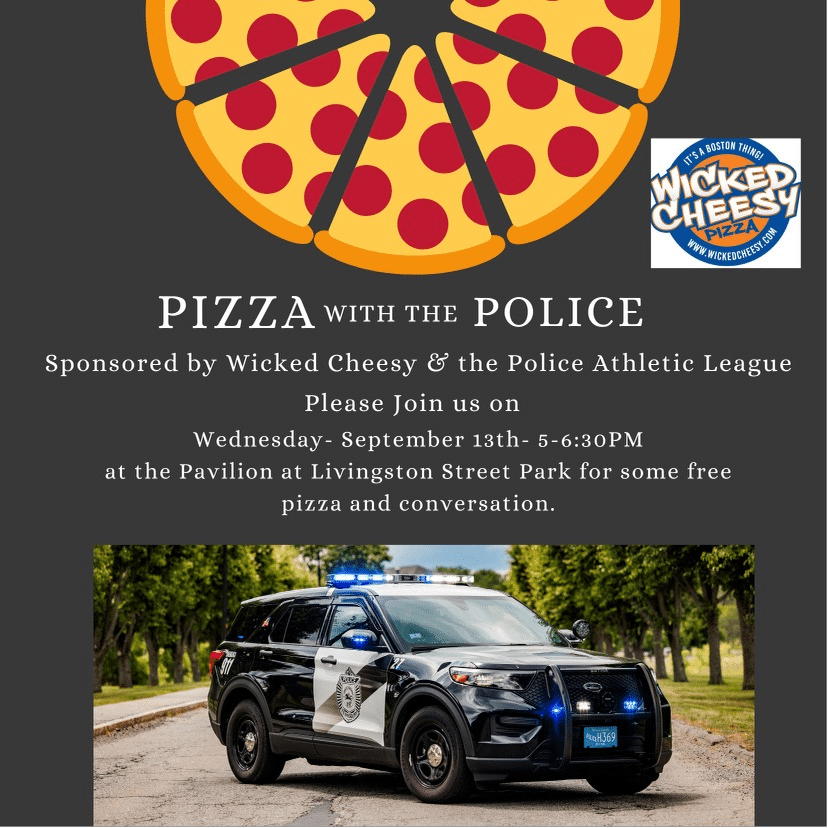 Pizza with the Police is being sponsored by Wicked Cheesy and the Tewksbury Police Athletic League. The rain date for the event is Wednesday, Sept. 27.