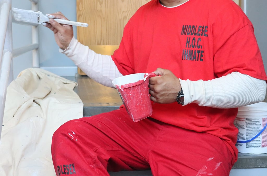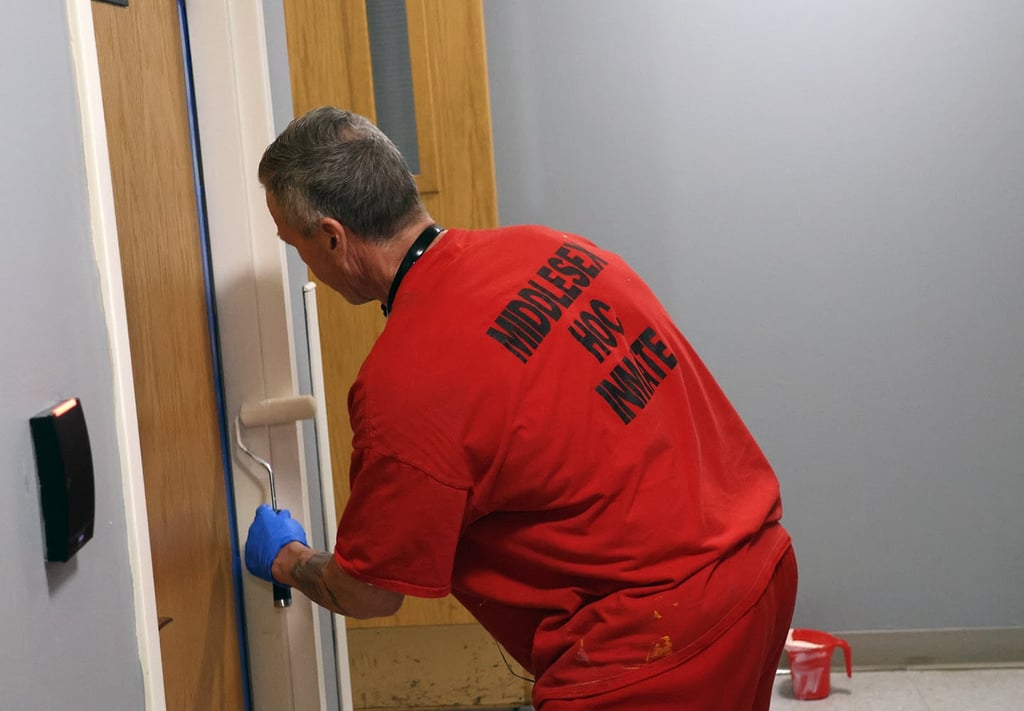 The four-man crew – supervised by an officer from the Middlesex Sheriff’s Office – worked in Tewksbury between March 3-28. They painted hallways, common spaces and the training room, among other spots inside the police station.