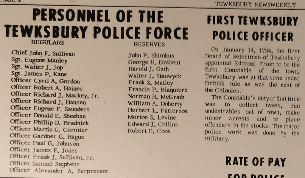 In 1734 the Board of Selectmen appointed Edmond Frost to be the first Constable in Town. At that time, Tewksbury was under British rule, as were the rest of the Colonies. His principal duties were to post warrants, collect the taxes, “run undesirables out of town”, make minor arrests, and to place offenders in the stocks. At that time the majority of police work was done by the military.
